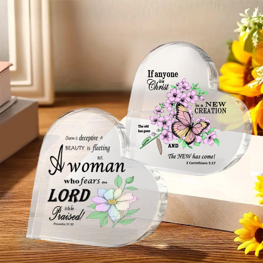 Proverbs 31:30 Heart Shaped Acrylic Desktop Ornament, Floral Bible Verse Graphic, Christian Gift for Her, Women of God, Valentine's Day Gift