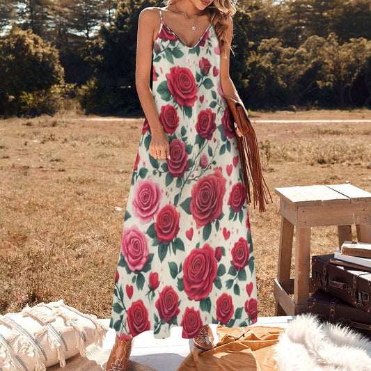 Sleeveless Boho Ankle Length Sling Maxi Dress Featuring Gorgeous Red Roses Print - Summer Outfit Essential