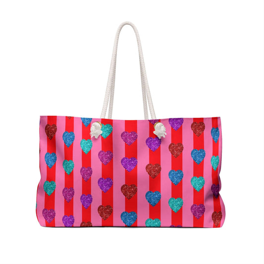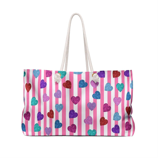 Weekender Bag, Heart Patterned Travel Tote, Overnight Duffel, Pink Striped Valentines Gift Bag, Large Carry-On Luggage, Colorful Love Theme