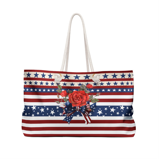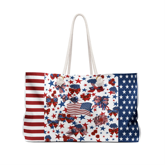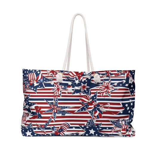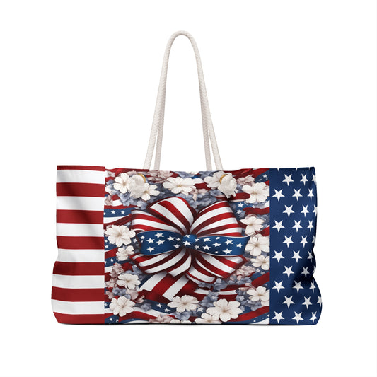 Patriotic Tote Roomy Oversized Bag with Star and Stripes Floral, Bow Patterns in Classic Red, White, and Blue Colors, USA Weekend Bag Design