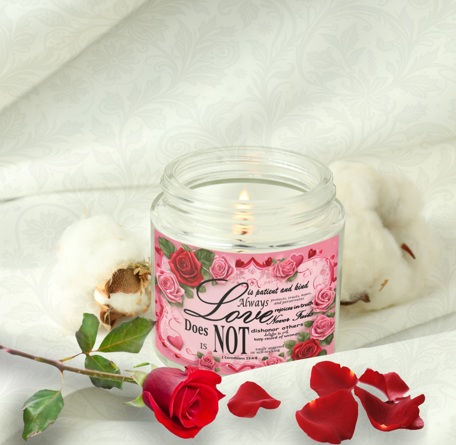 Soy Candle, 'Love is', Bible Verse 1 Corinthians 13:4-8, Hearts & Roses Design, Valentine's Gift, Home Decor, Religious Aromatherapy Candle