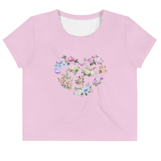 Cute Feminine Crop Pink Tee For Women with a Floral Design in the Shape of a Heart, Minimalist Graphic Decal Crop T-shirt Fun and Flirty Feminine - Perfect for Spring and Summer Fun Half Tee