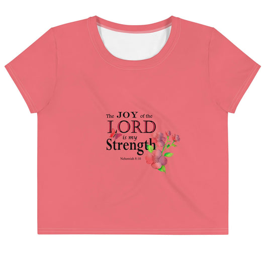 Minimalist Salmon Colored Crop T-Shirt For Women with Floral Bible Verse | 'The Joy of the Lord is My Strength' Graphic Art Design, crop top gift,