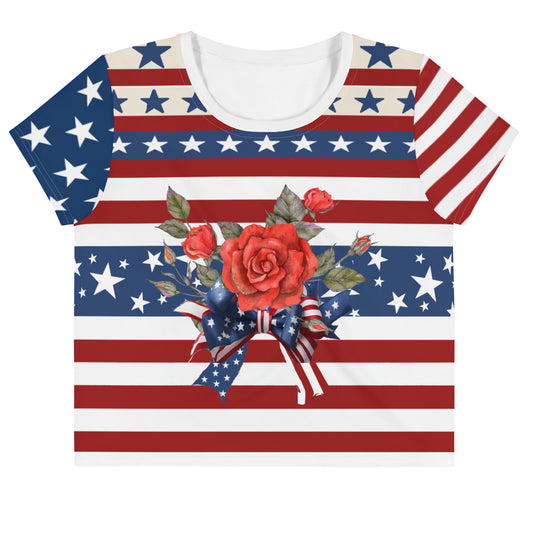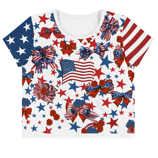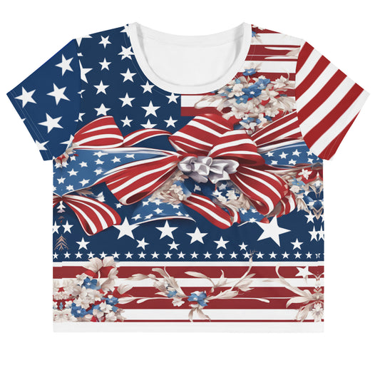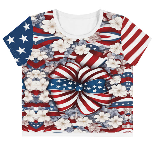 Women's Patriotic Crop Tee with USA Flag, Flowers, and Bows