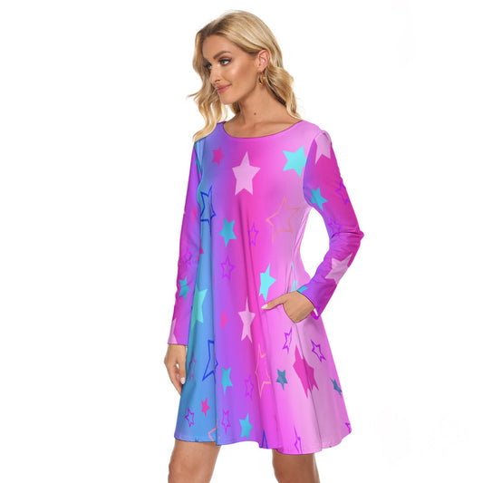 Women’s Crew Neck Dress – Purple, Pink & Blue Gradient with Stars Pattern, Dreamy & Comfortable Style