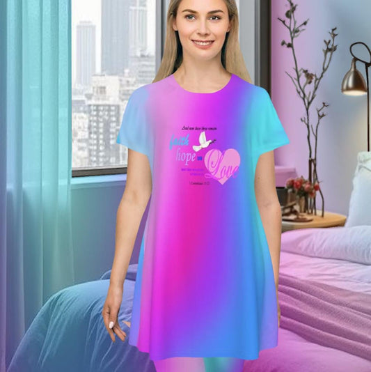 Faith Hope Love Oversized T-Shirt | Pink Blue Purple Gradient Tee, Inspirational Bible Verse, Women's Short Sleeve Nightshirt, Sleep Dress
