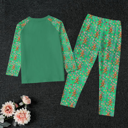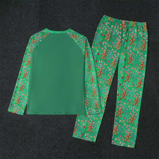 Kid's Green Gingerbread Man, Christmas Holiday Candy Winter Pajama Set, Matching family outfit, long sleeves loungewear, Holiday 2 pc