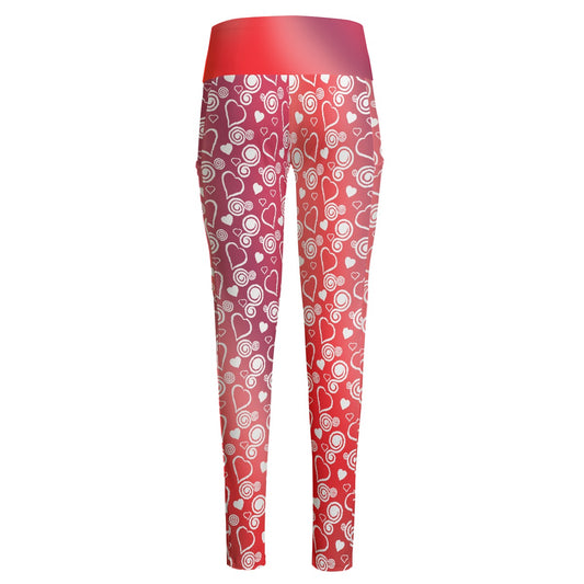 High Waist Yoga Leggings with Side Pockets Hearts and Swirls Pattern on a Red Gradient Background – Satin Drill Fabric for Women’s Activewear
