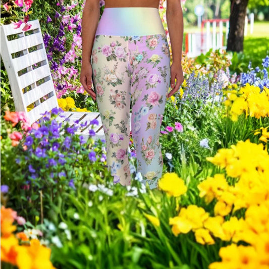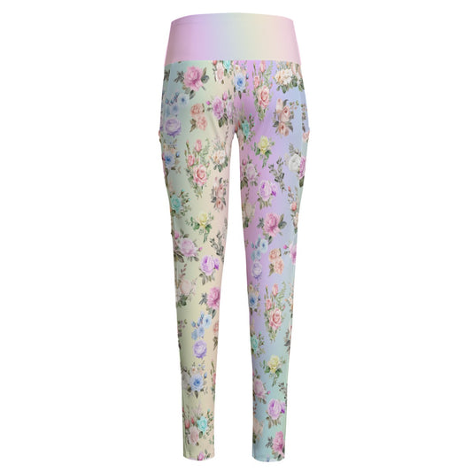 High Waist Yoga Leggings with Side Pockets Pastel Floral Rainbow Pattern – Satin Drill Fabric for Women’s Activewear