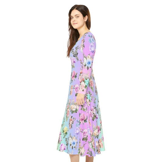 Women's Dance Dress, Pastel Rainbow Floral Design for Spring, Easter, or Mother's Day, Long Sleeve Costume Outfit Apparel, Cute Flowy Boho