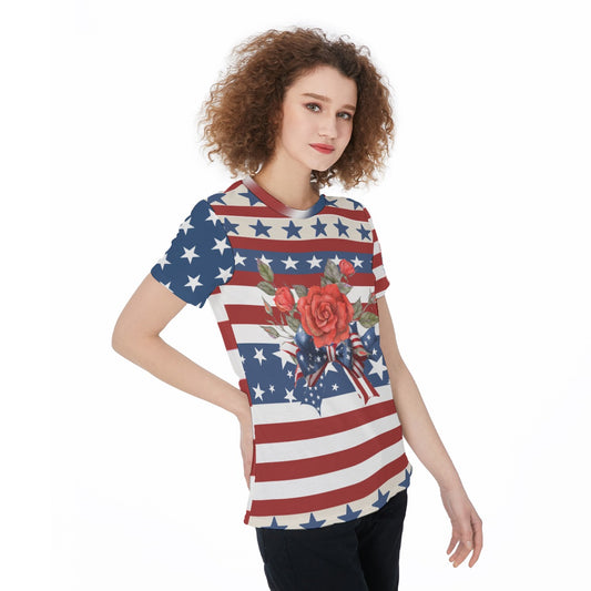 American Patriotic Tee - USA Flag Inspired Round Neck T-Shirt For Women - Lightweight, Casual, Festive Independence Day Sports Jersey Gym Workout Top - Lightweight and Trendy!
