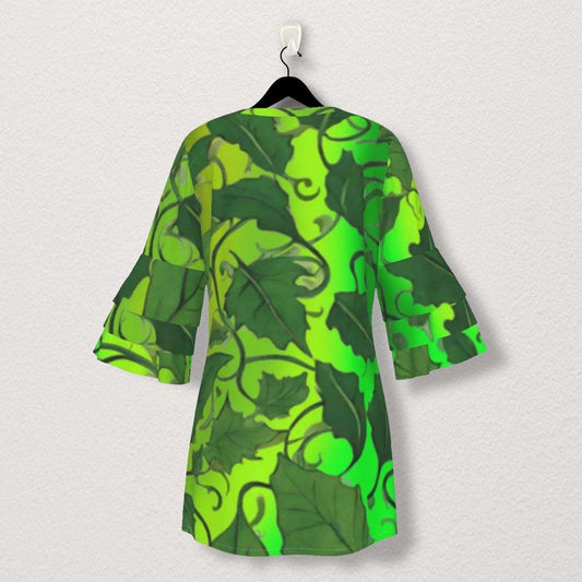 Boho Elegant Stacked Ruffle Sleeve Dress Adorned with Lush Green Vine Leaves on Beautiful Gradient Green Fabric