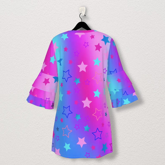 Dreamy Stacked Ruffle Sleeve Dress - Pink, Purple & Blue Stars on Gradient Background