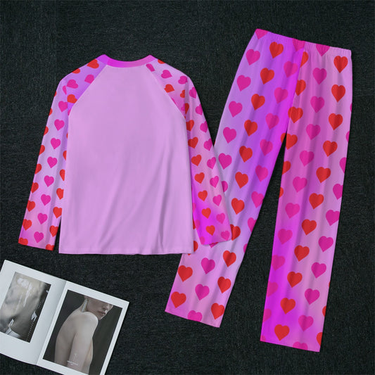 Red Hearts on Pink Gradient Women's Pajama Pants, Valentine's Day Lounge wear, Women's Matching Top and Pants long sleeves loungewear, 2 pc