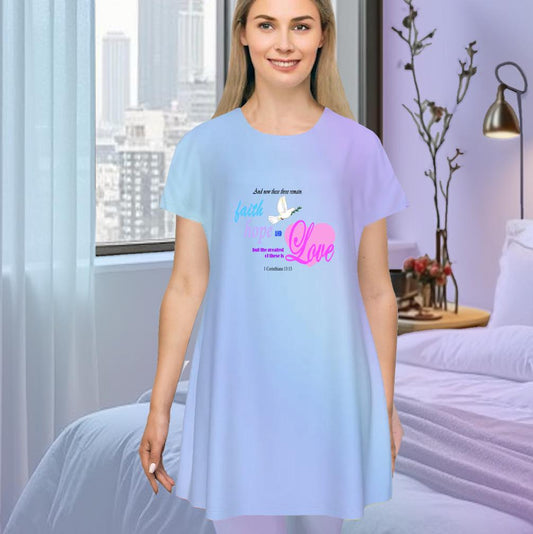 Faith Hope Love Oversized T-Shirt | Light Blue Gradient Tee with Inspirational Bible Verse, Women's Short Sleeve Night Dress