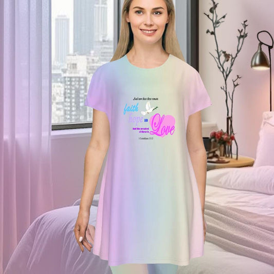 Faith Hope Love Oversized T-Shirt | Pastel Rainbow Gradient Tee, Inspirational Bible Verse, Women's Short Sleeve Nightshirt, Sleep Dress