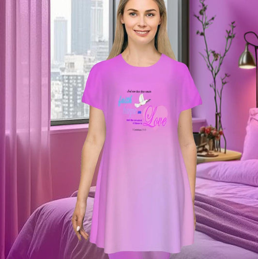 Faith Hope Love Oversized T-Shirt | Pink Gradient Tee with Inspirational Bible Verse, Women's Short Sleeve Nightshirt, Sleep Dress