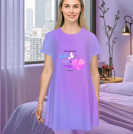 Faith Hope Love Oversized T-Shirt | Purple Gradient Tee with Inspirational Bible Verse, Women's Short Sleeve Nightshirt, Sleep Dress