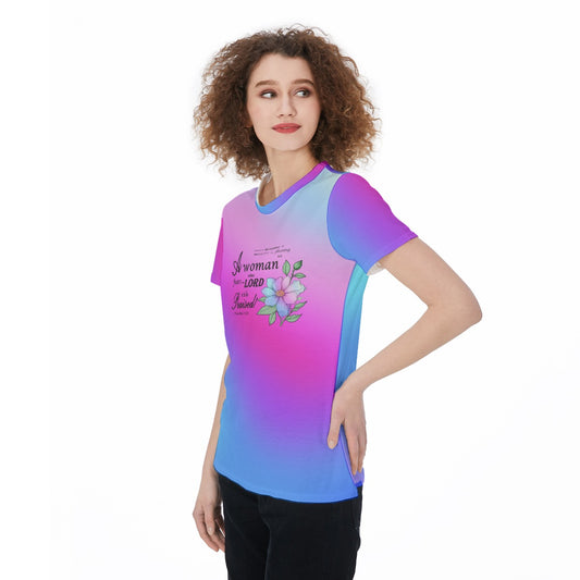 Floral Proverbs 31 Sports Jersey Tee Shirt For Women - Pink, Blue & Purple Gradient - Inspiring Bible Verse Graphic, Gift for her