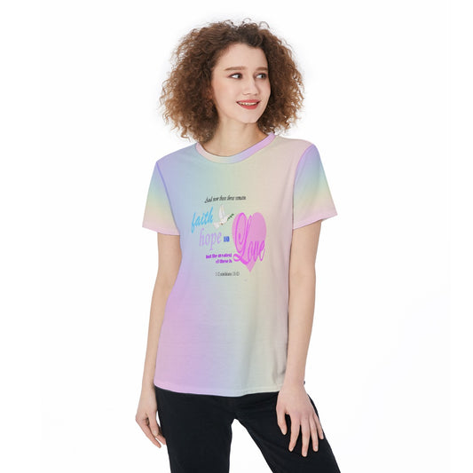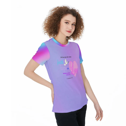 Faith Hope Love Bible Verse T-Shirt – Scripture Dove & Heart Graphic Tee – Pastel Rainbow Lightweight Jersey Shirt – Inspirational Scripture Tee For Women