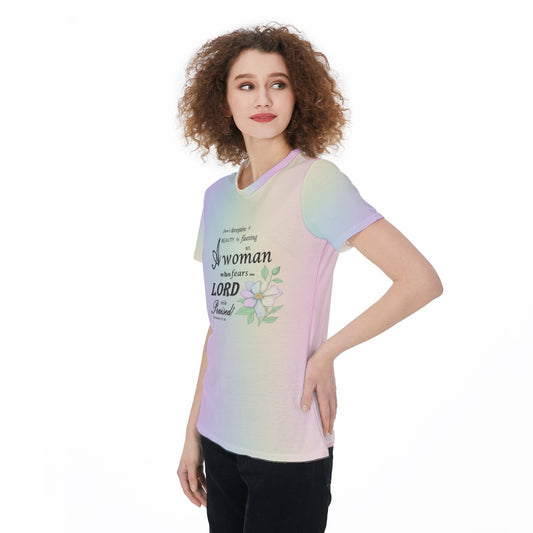 Proverbs 31 Woman Floral Scripture T-Shirt – Pastel Rainbow Lightweight Jersey Tee – Faith-Based Shirt for Women – Bible Verse Graphic Tee