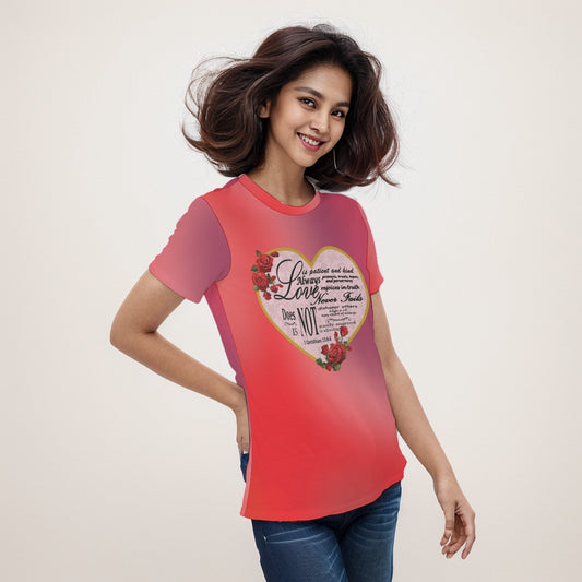 Floral Heart Jersey Tee For Women – 1 Corinthians 13 Bible Verse Shirt "Love Never Fails":