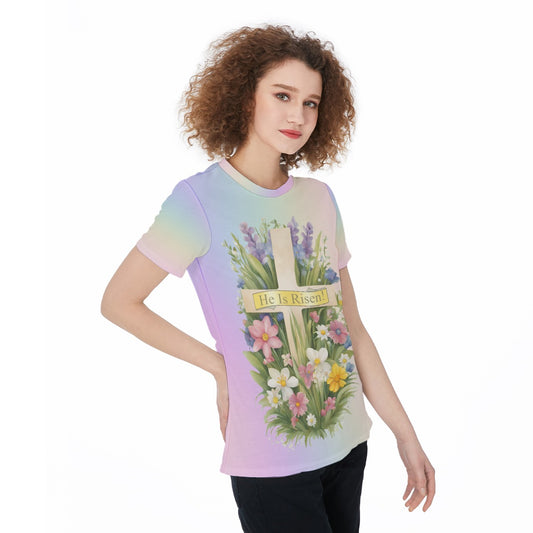 He Is Risen - Pastel Rainbow Easter T-Shirt with Cross & Spring Flowers | Lightweight Jersey Tee For Women