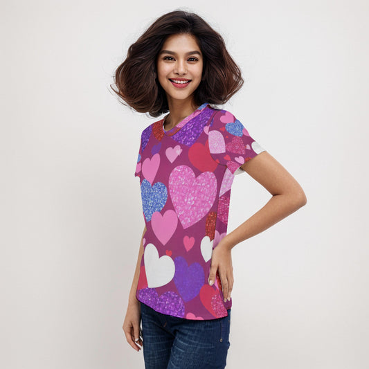 Vibrant Heart Print Women's Short Sleeve Shirt, Perfect for Valentine's Day, Love Gifts, Casual Wear, Birthday, Summer Outfits, Heart Theme