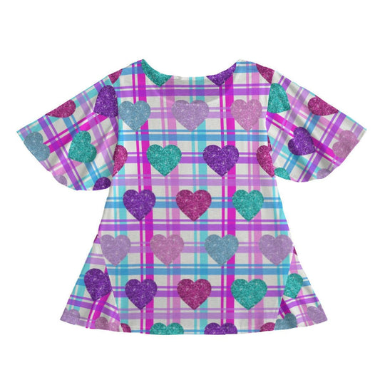 Cute Round Neck T-Shirt Mini Dress with Butterfly Sleeves & Heart Design on Pink Blue Purple Plaid Background