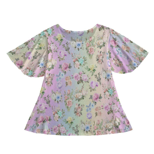 Women’s Round Neck Short Sleeve Butterfly Sleeves Tunic Mini Dress with Pastel Floral Design – Elegant Ruffle Hem Casual Fashion Top