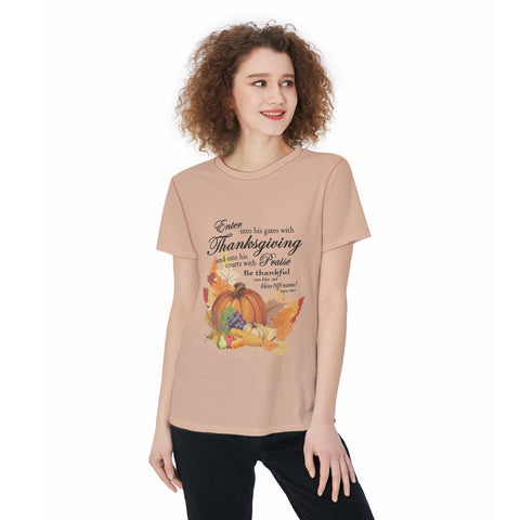 This women's sports jersey features a Thanksgiving bible verse with a fall harvest design graphic, giving a festive and cozy vibe. Perfect for those who enjoy sports or casual wear during the fall season. Ideal for Thanksgiving celebrations and fall activities.
