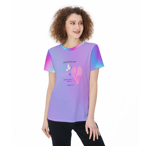 This women's sports jersey features a faith, hope, and love bible verse with a heart and dove design on a purple background. Perfect for those who love to showcase their faith while being active. Ideal for religious holidays and celebrations. Product features - 95% Polyester for durability and quick drying - 1x1 Ribbed collar and armholes for a well-fitted top - Vibrant colors with crisp printing techniques - Moisture wicking material to keep you cool during physical activity - Extra light fabric for a comfortable feel Care instructions - Do not dryclean - Do not iron - Tumble dry: low heat - Do not bleach - Machine wash: cold (max 30C or 90F), *hand wash will extend the quality of the product