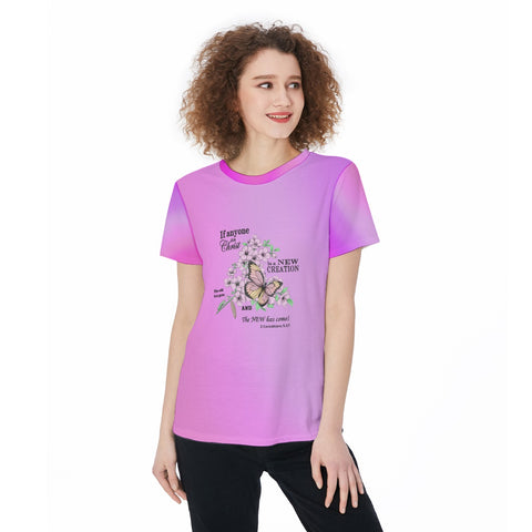 Women’s Scripture Jersey Tee – Caterpillar to Butterfly Design with 2 Corinthians 5:17 Bible Verse - Gradient Pink