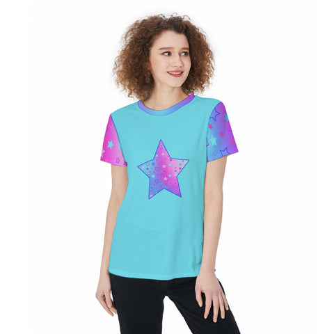 Vibrant Turquoise Women's Sports Jersey Tee Featuring Cute Star Graphic in Pink, Purple & Blue - Perfect for Athleisure or Pajama Top