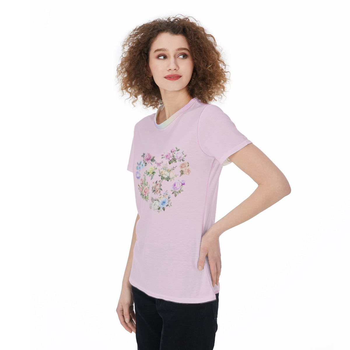 Introducing our charming lightweight jersey T-shirt, a perfect blend of comfort and style! This beautiful tee features a delightful heart-shaped graphic crafted from an array of pastel-colored flowers, set against a soft pink background. Ideal for adding a touch of femininity to any outfit, this shirt is perfect for casual outings, picnics, or lounging at home, and even comfortable enough to sleep in. Made from breathable materials, it ensures all-day comfort while showcasing your love for floral aesthetics. Don't miss out on this lovely addition to your wardrobe—grab yours today and spread the love!