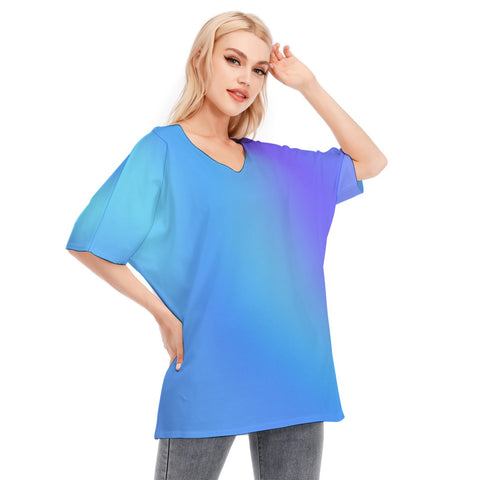 Loose Fit V-Neck Bat Sleeve T-Shirt Blouse with All Over Blue Gradient Design for Women