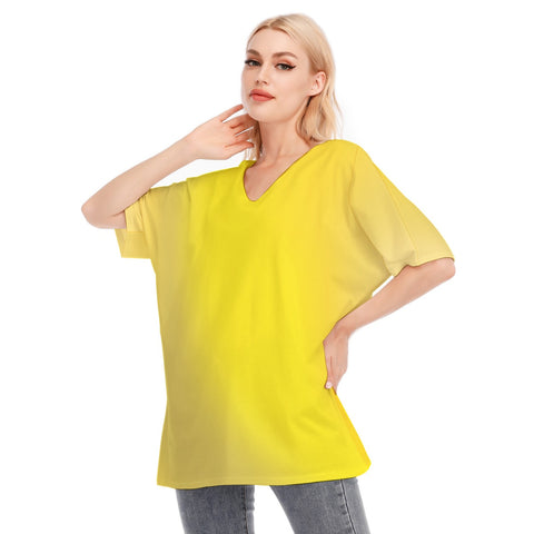 Loose Fit V-Neck Bat Sleeve T-Shirt Blouse with All Over Yellow Gradient Design for Women