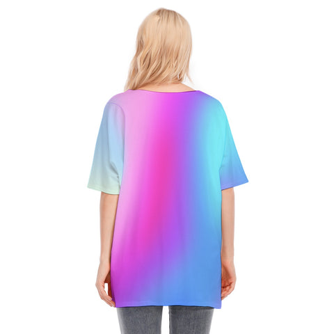 Loose Fit V-Neck Bat Sleeve T-Shirt Blouse with All Over Cool Colors (Blue, Pink, and Purple) Gradient Design for Women