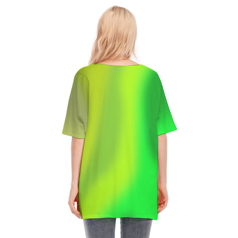 Loose Fit V-Neck Bat Sleeve T-Shirt Blouse with All Over Green Gradient Design for Women