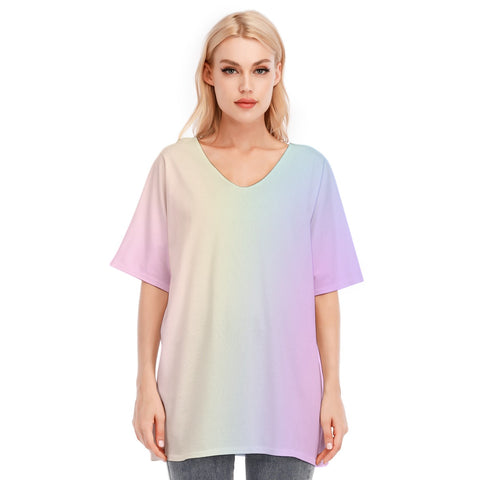 Loose Fit V-Neck Bat Sleeve T-Shirt Blouse with All Over Pastel Rainbow Gradient Design for Women