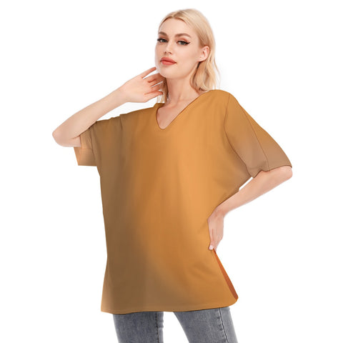 Loose Fit V-Neck Bat Sleeve T-Shirt Blouse with All Over Brown Gradient Design for Women