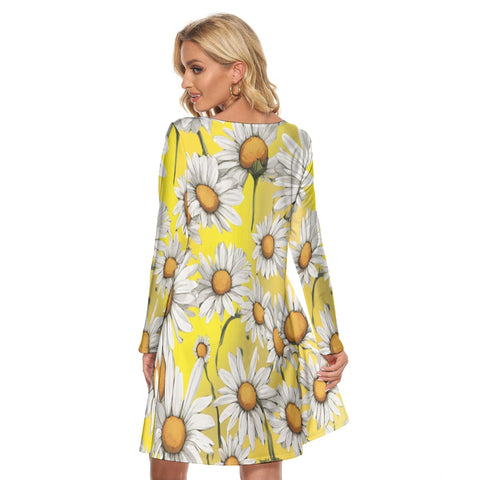 Women’s Crew Neck Dress – Daisy Pattern on Yellow Background, Fresh & Flowy Everyday Style