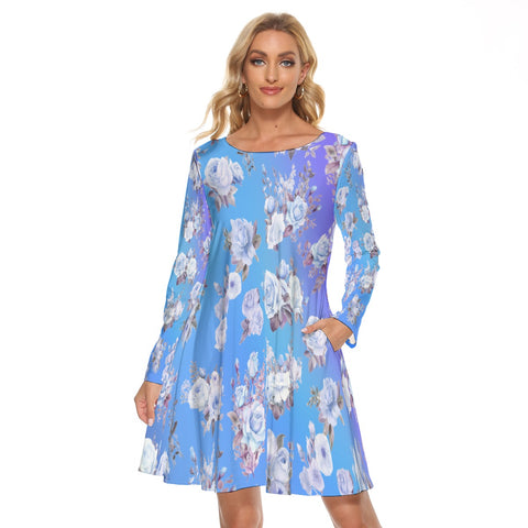 Women’s Crew Neck Dress – Blue Flowers on Blue Gradient Background, Soft & Elegant Everyday Style