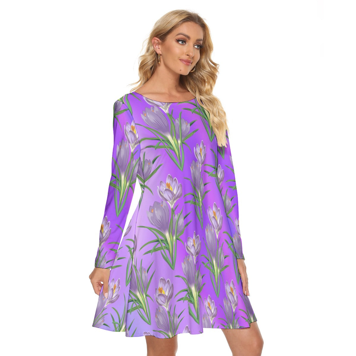 Step into refined beauty with this women’s crew neck dress adorned with delicate purple flowers set against a rich purple gradient background. Soft, lightweight, and flattering, this dress is perfect for adding a touch of floral elegance to your everyday wardrobe.