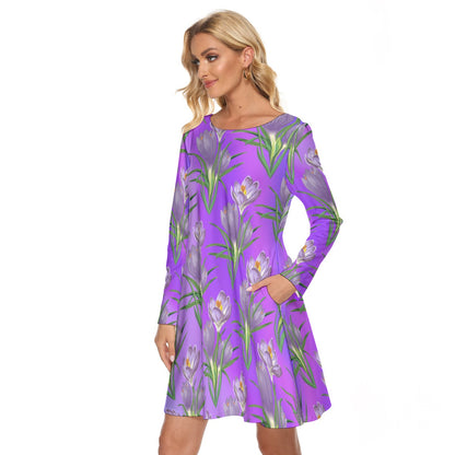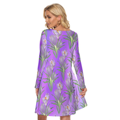 Women’s Crew Neck Dress – Purple Flowers on Purple Gradient Background, Elegant & Floral Everyday Style