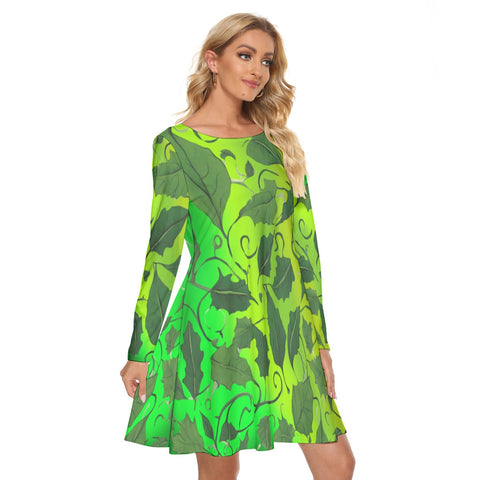 Women’s Crew Neck Dress – Leaves & Vines on Green Gradient Background, Nature-Inspired Style