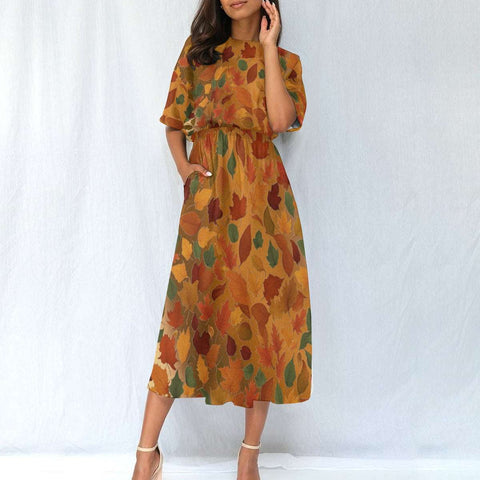 Women's Elastic Waist Dress – Autumn Dress with Fall Leaves Pattern, Lightweight & Flowy Fit