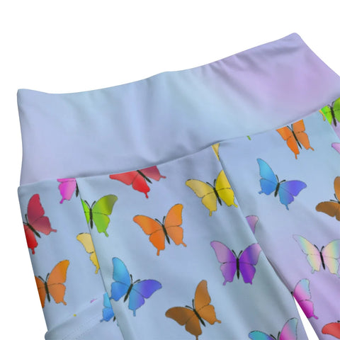 High Waist Yoga Leggings with Side Pockets Butterfly Pattern on a Light Blue Gradient Background – Satin Drill Fabric for Women’s Activewear