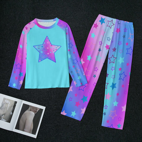 Indulge in dreamy comfort with this charming pajamas set featuring a stars pattern on a beautiful blue, pink, and purple gradient background. Made for cozy nights and lazy mornings, this set is sure to add a touch of whimsy to your bedtime routine. Perfect for lounging or sleeping, this set is as stylish as it is comfy. Treat yourself to a celestial bedtime experience!