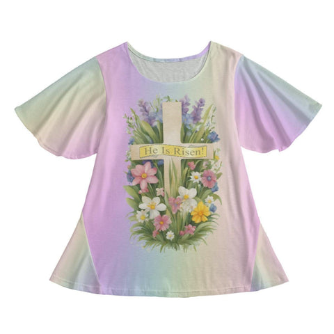 Easter Round Neck Short Sleeve Butterfly Sleeves Tunic Mini Dress For Women - A Cross with the Words 'He IS Risen' Among a Floral Garden on a Pastel Rainbow Background